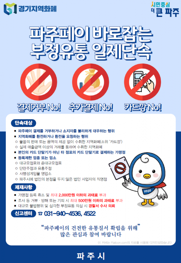 파주시는 단속기간 동안 파주페이 부정유통 신고센터를 운영해 부정유통 가맹점에 대해 신고할 수 있도록 했다.