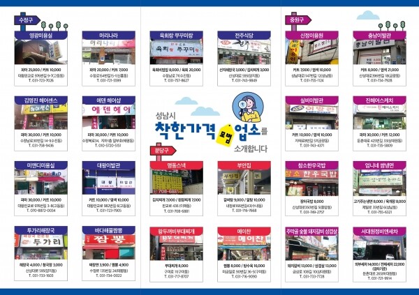 추가 지정한 착한가격업소는 해장국 가격 3000원인 수정지역 음식점 커트 가격 7000원~1만원인 중원지역 이발관 김치·된장찌개 가격 7000원인 분당지역 음식점 등이다.