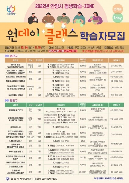 안양시 평생학습-ZONE 원데이클래스는 만안구 댕리단길과 동안구 동편마을 카페 거리 일대에 조성된 다양하고 특색있는 평생학습 ZONE의 홍보 및 활성화를 위한 체험학습이다.