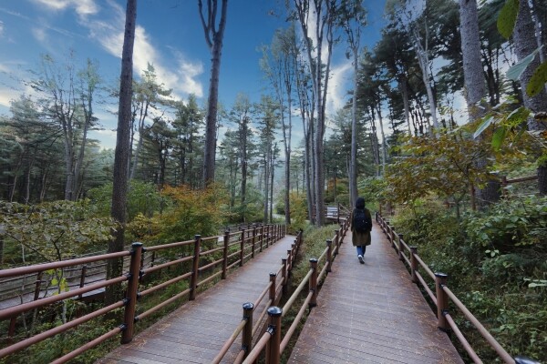 축령산과 서리산 사이, 해발 450~600m에 자리한 숲은 완만한 오르막과 내리막이 대부분이지만, 걷기가 고되지 않은 것은 무장애 나눔길과 데크로드 덕분이다.