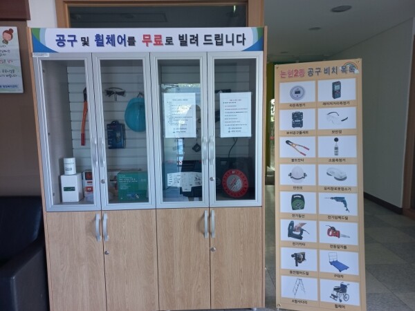 논현2동에 주소지를 두거나 사업장이 있는 19세 이상의 주민은 누구나 무료로 휠체어 등 16종의 생활 공구를 최대 3개까지 사흘간 대여할 수 있다.