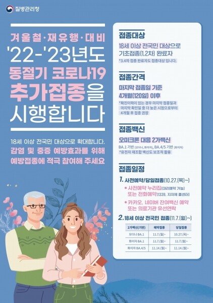 지난 10월 11일부터 면역저하자, 요양병원·시설 및 그와 유사한 감염 취약시설, 고령층 등 건강 취약계층 등을 대상으로 실시해오던 코로나19 동절기 추가접종 범위를 만 18세 이상의 건강한 성인까지 확대한 것이다.