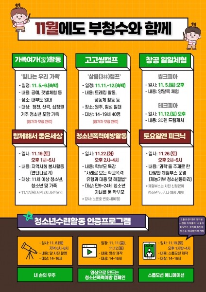 아울러 부평구 청소년수련관에서는 11월 12일까지 수련관 SNS 홍보와 활성화를 위해 인스타그램 팔로우 이벤트를 진행한다.