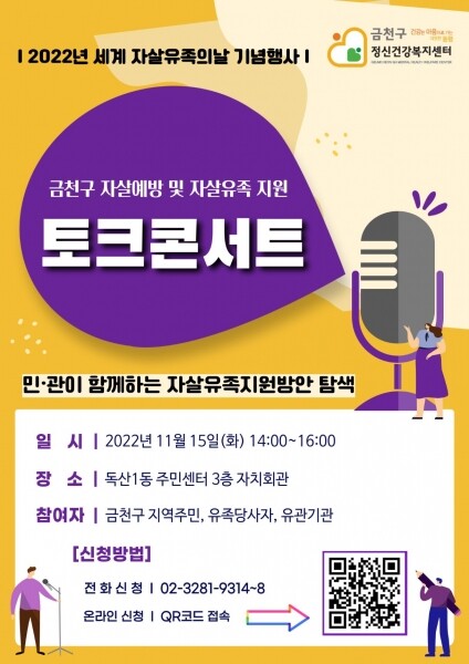토크 콘서트에 참여하고 싶은 사람은 11월 8일까지 금천구정신건강복지센터로 전화하거나, 행사 홍보물 하단의 QR코드 접속을 통해 온라인으로 신청하면 된다.