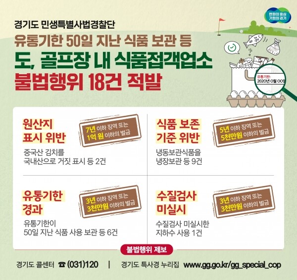 경기도 민생특별사법경찰단은 지난 10월 4일부터 14일까지 안성과 용인, 여주 등 도내 8개 시군 82개 골프장 내 식품접객업소 118곳을 단속한 결과 식품위생법, 원산지표시법을 위반한 17개 업소를 적발했다고 31일 밝혔다.