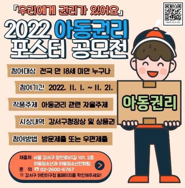 김태우 구청장은 “아동이 직접 참여하는 공모전으로 자칫 소홀하기 쉬운 아동 권리의 중요성에 대한 생각을 나누는 공감의 장이 마련될 것으로 기대한다”며 “아동 권리 증진을 위한 지역사회 인식 개선을 통해 아이들이 마음껏 꿈을 펼칠 수 있는 아이 키우기 좋은 강서를 만들어나가겠다”고 말했다.
