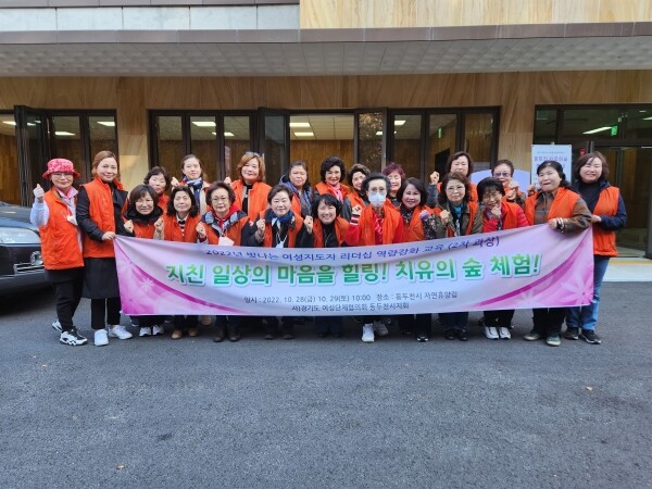 이날 실시한 힐링 교육은 동두천시 양성평등지원기금사업 “빛나는 여성지도자 리더십 역량강화 교육” 공모를 통해 선정된 사업 가운데 하나로 동두천시 치유의 숲 체험장에서 숲 해설사의 강의와 등산로 산책, 찜질 체험 등의 프로그램을 진행, 깊어가는 가을의 정취를 느끼며 힐링의 시간을 가졌다.