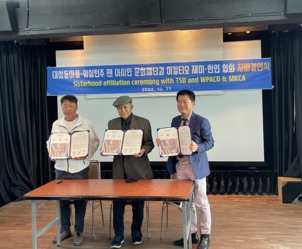 이번 협약식은 김동구 대성동 이장, 김원준 워싱턴주 팬 아시안 문화재단 부회장, 머킬티오 재미 한인협회 제임스 유 ACE메탈 최고경영자 등 50여명이 참석한 가운데 진행됐다.