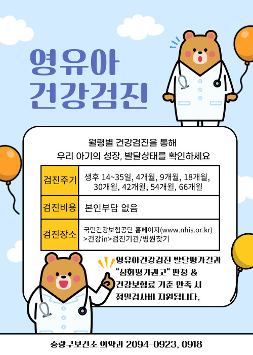 류경기 중랑구청장은 “중랑의 미래인 영유아들이 건강하게 자랄 수 있도록 건강검진 외에도 다양한 건강 증진 프로그램을 마련하는 데 최선을 다하겠다”고 말했다.
