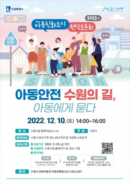2022. 아동 친화도시 원탁토론회는 ‘아동안전 수원의 길, 아동에게 묻다’를 주제로 12월 10일 오후 2시부터 4시까지 수원시청 중회의실에서 개최된다.