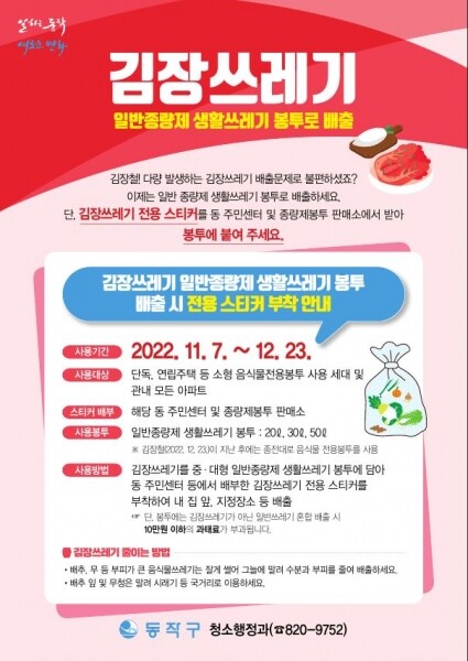 박일하 동작구청장은 “김장철을 맞아 김장쓰레기 배출에 불편함이 없도록 일반 종량제 봉투에 담아 배출하는 것을 허용하도록 했다”며 “쾌적한 주택가 환경을 조성하기 위해 주민분들의 많은 참여 바란다”고 말했다.