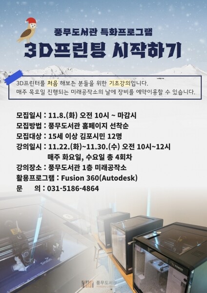 강의는 15세 이상의 김포시민 12명을 대상으로 11월 22일부터 30일까지 매주 화요일과 수요일 오전 10시부터 풍무도서관 1층 미래공작소에서 진행된다.