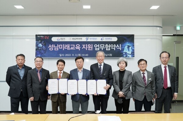 이를 위해 시는 11월 3일 오전 10시 40분 시청 2층 회의실에서 신상진 성남시장과 신승균 성남교육지원청 교육장, 김영철 한국잡월드 이사장, 김원 가천대학교 수석부총장 등이 참석한 가운데 ‘성남미래교육 지원사업 추진을 위한 협약’을 했다.
