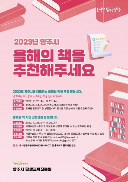 ‘2023년 양주시 올해의 책’은 시민이 주도하는 도서 선정을 통해 책 읽는 문화 확산과 독서인구 저변 확대에 기여하고자 추진된다.