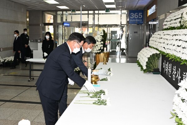 [뉴스서울] 강수현 양주시장을 비롯한 간부 공무원들이 3일 경기도 북부청사에 마련된 이태원 사고 사망자 합동분향소에서 찾아 헌화와 묵념을 하며 조문하고 있다.