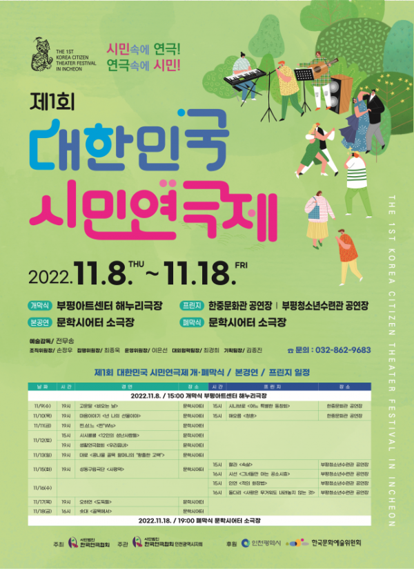 이번 연극제는 11월 8일 오후 3시 부평아트센터 해누리극장 개막식을 시작으로 각 시·도를 대표하는 9개 연극 단체들이 전국 최고의 시민극단을 선발하기 위한 경연을 펼친다.