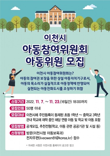 모집 대상은 이천시에 주민등록이 등재된 초등학교 1학년부터 중학교 3학년 아동이나 관내 재학중인 해당 연령 및 학교밖 아동 약 50명 내외이며 2년의 임기를 수행하게 된다.