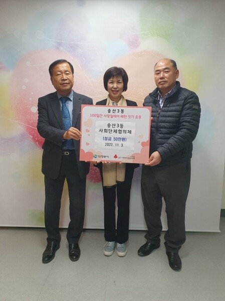박금숙 송산3동 복지지원과장은 “어려운 이웃을 위해 후원해주신 송산3동 사회단체협의체 위원님들에게 진심으로 감사드리며 기탁해 주신 성금은 저소득 취약가구를 위한 사랑의 김장나눔에 쓰여지도록 하겠다”고 감사의 인사를 밝혔다.