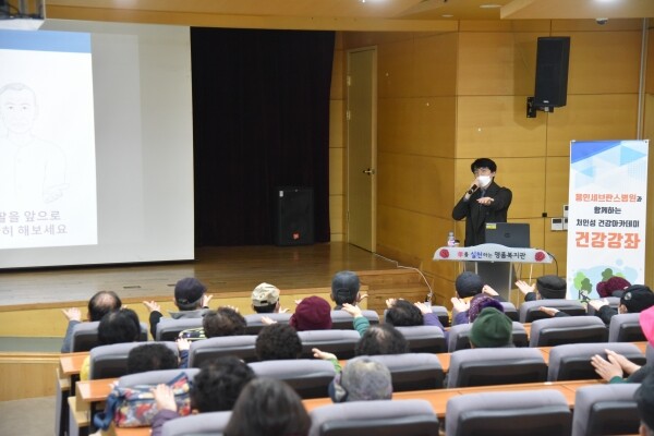 이날은 용인연세세브란스병원 백민렬 교수를 초빙해 ‘뇌졸중’ 주제로 진행됐으며 질환에 대한 정확한 이해를 돕기 위해 질병의 정의부터 원인과 증상, 자가진단법, 치료법 및 생활습관 등 다양한 내용으로 어르신들의 큰 호응을 이끌었다.