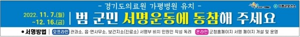 가평군에서는 민간부문의 의료서비스 제공의 한계로 인해 군민들에게 지속적인 공공 의료서비스를 제공하고 민선8기 서태원 가평군수의 공약사항인 공공의료원 가평유치를 촉구하고자 공공의료원 설립을 열망하는 군민의 염원이 담긴 서명부를 다음달 말일 경기도에 전달할 방침이다.