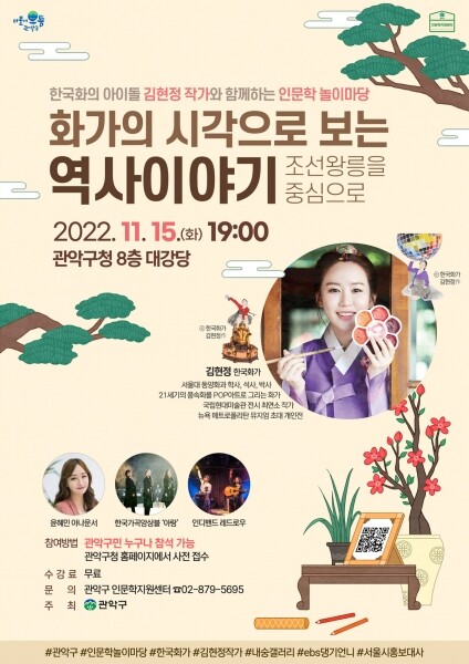 오는 15일 오후 7시 관악구청 8층 대강당에서 한국화가 김현정 작가와 함께하는 ‘화가의 시각으로 보는 역사 이야기’ 인문학 놀이마당을 진행한다.