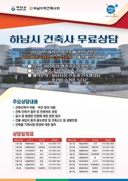 이는 지난 9월 하남시가 하남지역건축사회와 가진 간담회에서 건축사 무료상담실 운영 방안을 협의한 데 따른 것이다.