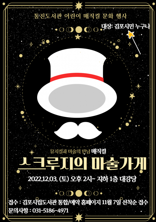 시립도서관 소영만 관장은 “연말을 앞두고 도서관에서 어린이들에게 특별한 추억을 만들어주고자 매직컬 공연을 마련했다”며 “가족과 함께 행복한 시간이 되시길 바란다”고 말했다.
