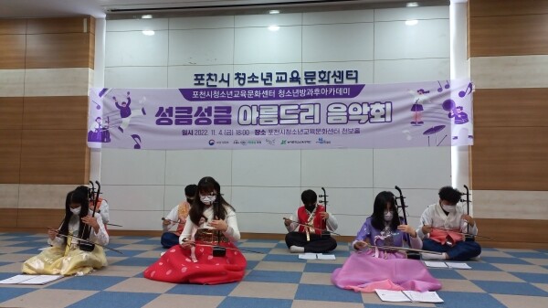 음악회는 농어촌청소년육성재단의 ‘성큼성큼 꿈자람 프로젝트’에서 진행한 해금 연주를 포함해 타악기, 사물놀이, 칼림바 등을 발표해 청소년의 기량을 마음껏 뽐냈다.