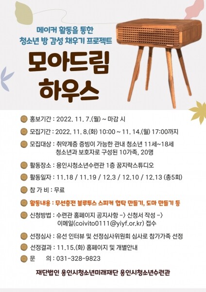 취약계층 증빙이 가능한 관내 청소년 11세~18세 청소년과 보호자 1인으로 구성된 10가족을 대상으로 진행하는 이번 프로그램은 무선충전 블루트스 스피커 협탁 만들기, 도마 만들기, 온라인OT 및 활동평가회 등 가족 간 메이커 활동을 통해 창의 융합 능력 및 협업소통 능력 향상을 위해 기획됐다.