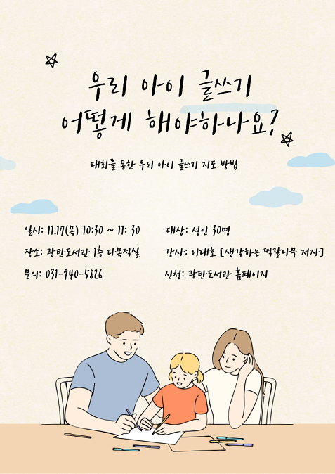 강좌 관련 자세한 사항은 광탄도서관 홈페이지를 확인하거나 프로그램 담당자에게 문의하면 된다.