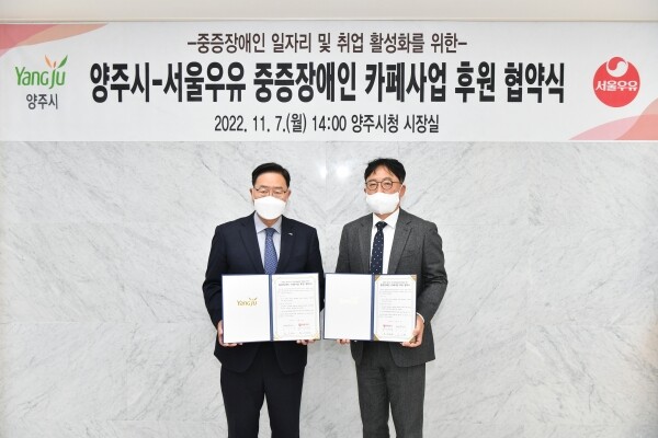 강수현 시장은 “관내 장애인 일자리 사업과 직업재활 지원을 위한 중증장애인 카페사업 활성화 후원 협약 체결에 적극적으로 나서준 서울우유협동조합 임직원 여러분에게 감사하다”며 “양주시 중증장애인들의 경제적 자립능력 향상과 복지증진을 위한 사회공헌에 더욱 노력해달라”고 당부했다.