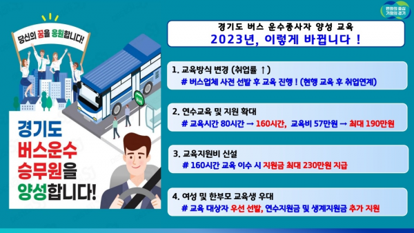 우병배 경기도 버스정책과장은 “사업 확대 시행으로 도민의 발이 되어줄 양질의 버스 운수종사자를 안정적으로 양성하고 도민들의 취업난 해소에 도움이 될 것으로 기대된다”며 “운수업체·종사자, 시군과 지속 소통하며 도민들의 대중교통 편의를 증진하도록 최선을 다하겠다”고 밝혔다.
