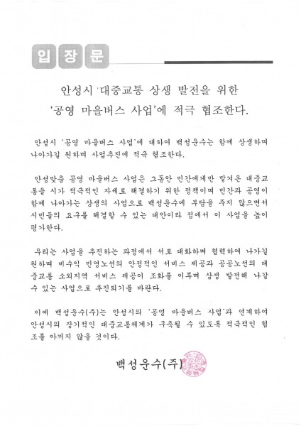시는 최근 공영 마을버스 사업에 대한 사업 보고 주민설명회 등의 여러 업무를 추진하면서 사업에 대한 기존 운수회사의 입장을 묻는 의견이 있어 이를 백성운수 측에 요청한 결과, 백성운수에서는 “안성시의 공영 마을버스 사업에 대해 적극 협조할 것이며 상생 발전을 원한다”는 입장문을 회신했다.