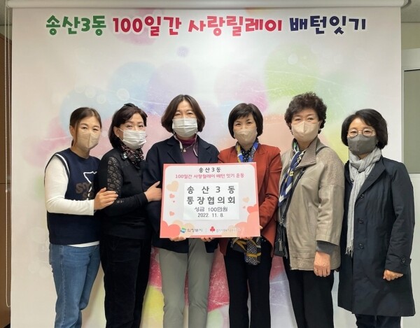 이날 기탁식에 참여한 정서정 송산3동 통장협의회장은 “우리 지역의 어려운 이웃을 위해 통장님들이 힘을 모아 100일간 사랑릴레이에 참여하게 됐으며 앞으로도 지역사회의 도움이 필요한 곳에 항상 함께할 수 있도록 노력하겠다”고 말했다.