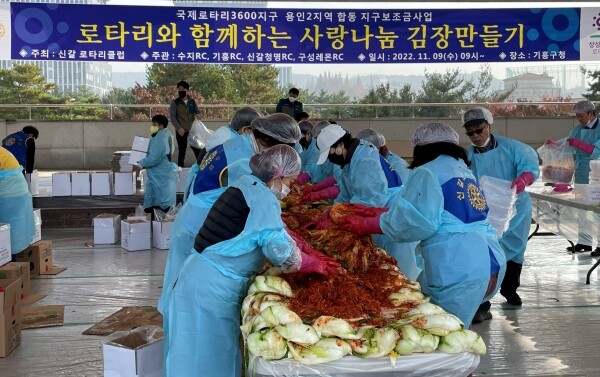 국제로타리3600지구 용인2지역 소속 클럽 합동으로 준비한 이날 행사에는 80여명의 회원들이 참여해 어려운 이웃을 돕기 위한 김치 담그기에 구슬땀을 흘렸다.