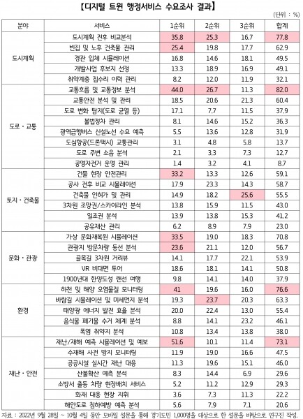 이에 경기도 도민의 69.9%는 디지털 트윈 기술을 행정서비스 분야에 도입하는 것이 필요하며 71.2%가 문제상황에 대한 빠른 대처가 가능하다는 점을 기대하고 있는 것으로 나타났다.