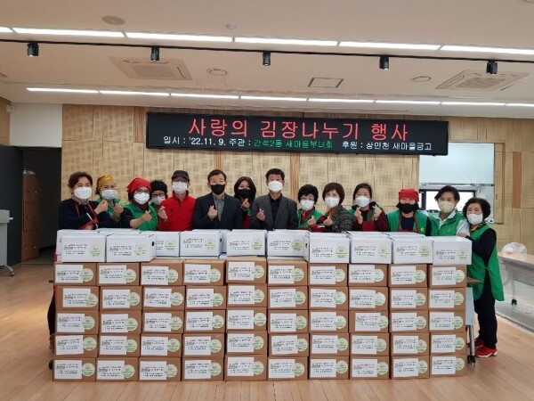 남찬우 동장은 “아침 일찍부터 나와서 김장김치를 직접 버무리고 포장한 새마을 부녀회의 수고와 따뜻한 손길에 감사드리며 아울러 아낌없는 후원을 베풀어 주시는 상인천새마을금고에 더욱 감사드린다 나눔 문화 확산을 위해 행정적인 지원을 아끼지 않겠다”고 전했다.