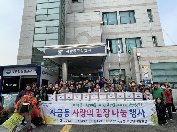 조원상 자금동장은 “모두가 어려운 시기에 김장 나눔 행사에 참여해주신 자생단체 회원님들께 감사의 말씀을 전하며 겨울철 월동준비가 힘겨운 이웃들에게 조금이나마 따뜻한 마음이 전달될 것이다”고 밝혔다.
