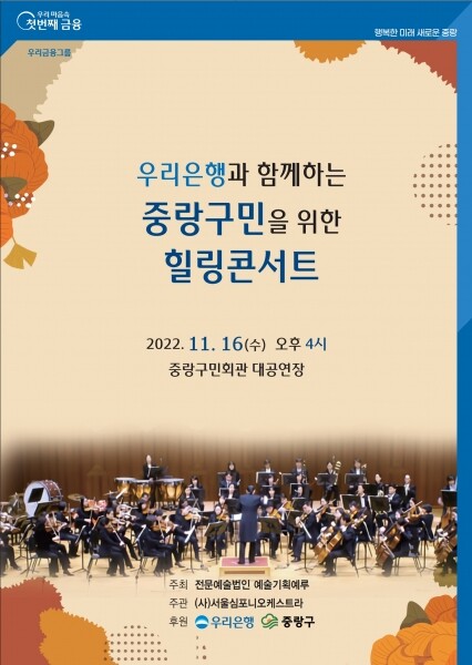 서울심포니오케스트라가 주관하고 중랑구와 우리은행의 후원으로 진행되는 이번 힐링 콘서트는 구민들에게 음악이라는 매개체를 통해 힐링과 휴식의 시간을 제공하고자 마련됐다.
