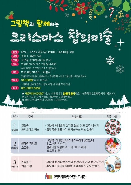 12월 9일 그림책 ‘애너벨과 신기한 털실’을 읽은 후 양말목을 활용해 크리스마스 리스 만들기 12월 16일 그림책‘ 커다란 크리스마스트리가 있었는데’를 읽은 후 클레이를 이용해 크리스마스 케이크 오르골 만들기 12월 23일 그림책‘눈사람 아저씨와 눈 강아지’를 읽은 후 슈링클스 키링 만들기가 진행될 예정이다.