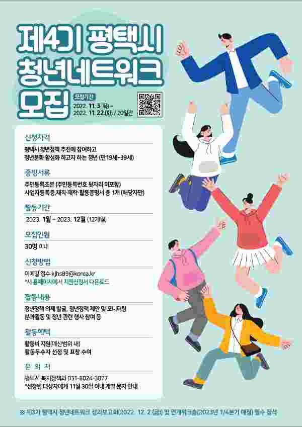 참여 대상은 평택시에 거주하거나 평택시 청년문화 활성화에 참여하고자 하는 청년이면, 누구나 신청 가능하다.