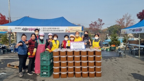 회천2동지역사회보장협의체, 맑음수지봉사회, 적십자양주시지회는 양주자원봉사센터 사랑의 김장나눔 축제에 참여해 각각 7kg 60박스, 7kg 18박스, 7kg 8박스를 기부하며 기부릴레이 시작을 알렸다.