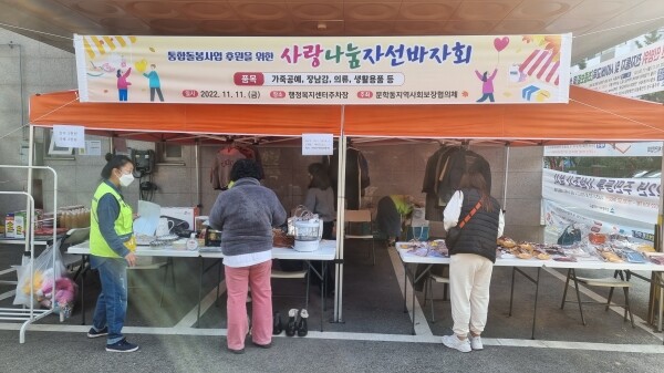 바자회에서는 가죽공방 동아리에서 기부한 가방, 지갑 등 가죽공방 제품 140여개와 지역사회보장협의체 위원들이 기부한 의류, 생활용품, 김치 등이 판매됐으며 수익금 전액은 문학동 특수시책 통합돌봄사업 ‘온 마을이 함께하는 저소득층 자녀 지원 사업’을 위해 동 행정복지센터에 전달됐다.