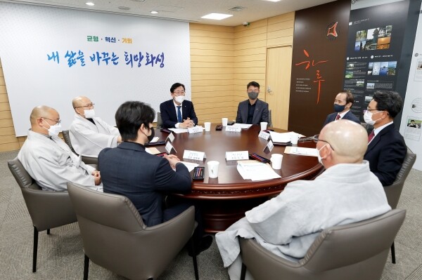 10일 화성시청 접견실에서 열린 종교지도자 긴급 대책회의에는 정명근 화성시장과 기독교 총 연합회 행복한교회 권상일 목사, 동탄동부광성교회 김학종 목사, 천주교 화성지구 남양성당 양하영 신부, 불교 조계종 만의사 일중 주지스님, 용주사 자정 스님, 불교 태고종 금수사 도암 주지스님이 참석한 가운데 진행됐다.