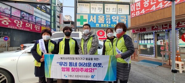 가평군 희망복지지원단과 명예사회복지공무원이 함께 관내 병·의원, 약국, 편의점을 직접 방문해 홍보 리플렛 및 스티커 부착 등 건강취약계층과 어려운 청·장년 1인가구 등 취약계층 발굴에 힘쓰고 있다.