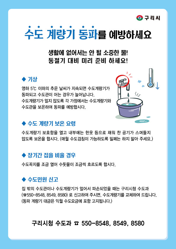 백경현 구리시장은 관계공무원들에게 “동파사고가 발생하지 않도록 사전 점검 및 대비태세를 확립하라”고 당부했고 시민들에게는 “각 가정에서 노출된 수도관 등에 동파사고가 발생되지 않도록 사전 보온 조치를 취해 줄 것을 부탁드린다”고 전했다.