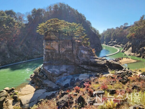 [뉴스서울] 철원 한탄강 위에 15m 높이로 우뚝 솟은 바위와 그 위를 장식하는 소나무 군락. 그리고 현무암 기암절벽과 그 절벽 쪽으로 길게 뻗어 나간 모래톱이 어우러지는 환상적인 풍경은 기묘하다.