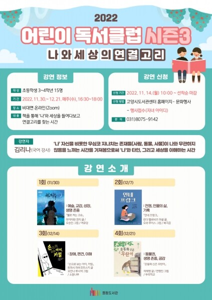 프로그램 신청은 11월 14일 오전 10시부터 고양시도서관센터 홈페이지를 통해서 선착순 15명까지 가능하며 회차별 주제 관련 그림책은 미리 읽고 와야 원활한 독후활동이 가능하다.