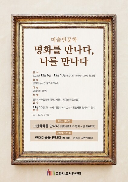 1차시 레오나르도 다빈치로부터 빈센트 반 고흐까지 고전 회화를 만나다 2차시 폴 세잔느에서 천경자, 김환기까지 현대미술을 만나다의 주제로 구성된 이 강연은 시대를 초월한 명작들에 대한 입체적인 스토리텔링과 큐레이션을 제공한다.