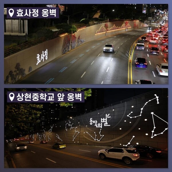 먼저 동작구 상현중 주변 옹벽은 ‘동작의 하늘 속으로’ 콘셉트로 밤하늘을 수놓는 아름다운 별자리를 LED 조명으로 구현해 빛나는 동작구를 표현했다.